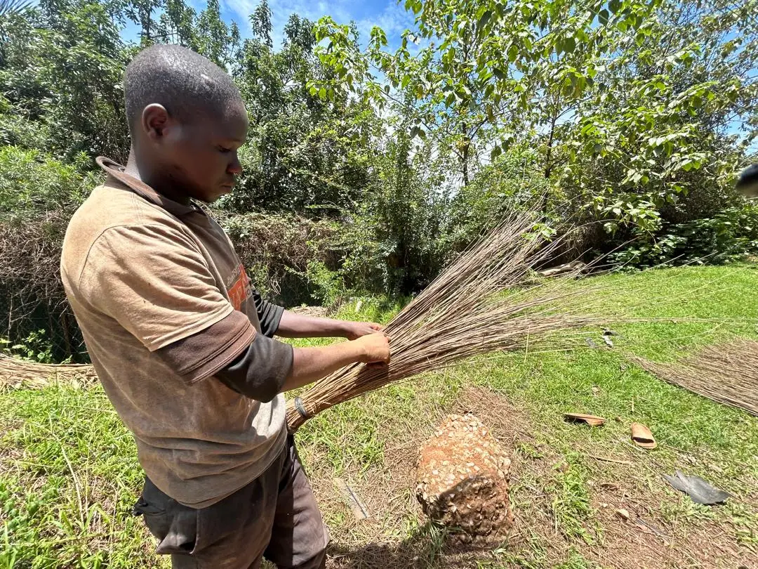 Maar, ik had het over wandelen. Op onze vaste route ontmoeten we bijna elke dag Marc. Een jonge Oegandees die op zijn vaste stekkie, een grote steen langs de kant van de weg,  bezems maakt van afgewaaide palmboombladeren. Om die vervolgens te  verkopen. De fabricage gaat met handen en voeten en er komt geen mes of snoeischaar aan te pas. Als we iets eerder aan de wandel zijn, komen we Marc tegemoet, verscholen onder een enorme bundel palmbladeren die hij onderweg verzamelt.