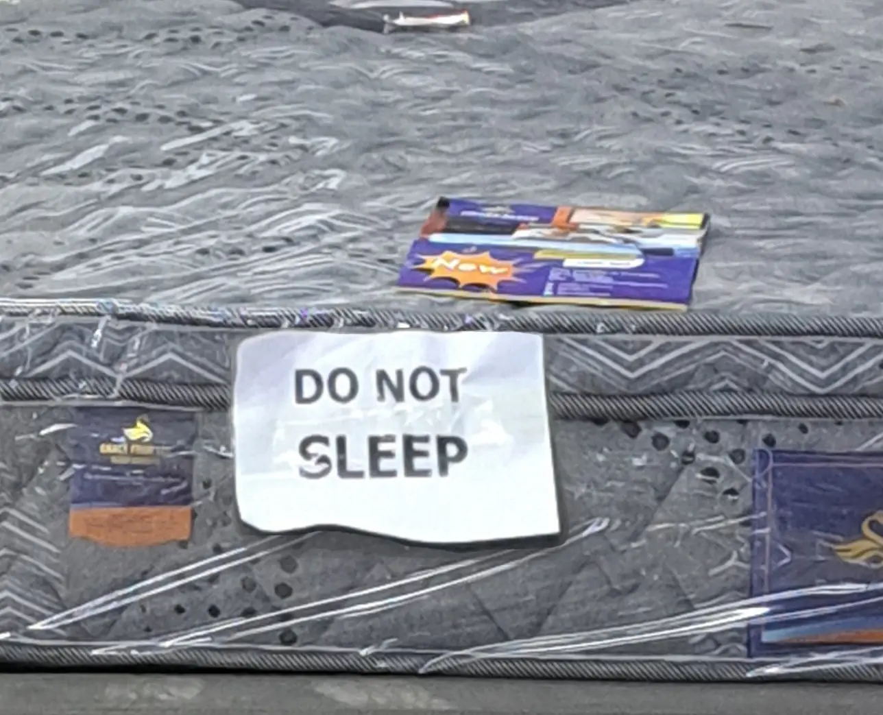 Mijn aandacht bij de beddenafdeling werd getrokken door de verzoeken die bij de bedden staan. Er wordt niet gevraagd of je je schoeisel even naast het bed wilt zetten. Aangezien de hele boel in plastic is verpakt, heeft men geen moeite met klanten die hun schoenen aanhouden. Nee, bij deze beddenafdeling wil men iets heel anders voorkomen. Het bordje: DO NOT SLEEP laat niets te raden over. Testen prima maar wel met open ogen.