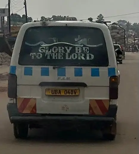 Godsdienstige uitingen en boodschappen kom je ook op de talloze taxibusjes en vrachtwagens tegen. Op het rijdend materieel wordt met grote regelmaat een beroep gedaan op Jezus of Allah. ’In God we trust’, is zo’n boodschap. Zodra je je in het verkeer van Kampala begeeft, heb je de neiging dat voor alle zekerheid toch maar te doen.